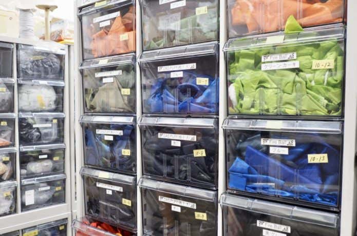 整理棚にはきれいに仕分けされたリペア用の素材の数々がストックされています。パーツや素材の種類・色ごとに整理されており、ここから当て布などを見つけ、修理していくのですが……。