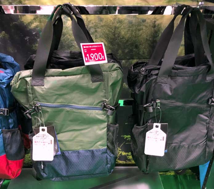 容量たっぷりのパッカブルトートバッグ。山に持って行かない道具を車に置いておくときにも良さそうですね。