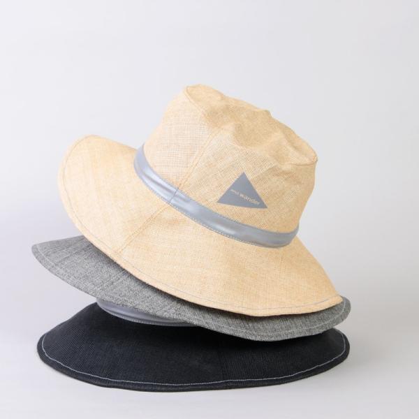 生地はペーパークロスを使い、ロゴとリボンとステッチは夜間でも光に反射するリフレクター素材。ハットの内側はポリエステルのメッシュ生地を配して、頭部の不快な蒸れを解消するので、ハイキングやキャンプなどで動いても快適です。