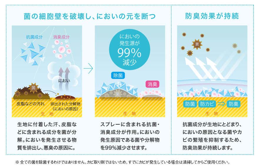 「O.D.メンテナンス抗菌消臭スプレー」は、スプレーに含まれる抗菌・消臭成分が作用して菌の細胞壁を破壊し、においの元を「99%」減少・死滅させます。