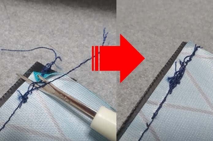 リッパーで、縫い糸を切り取って、その部分を上書きするように縫い直し。生地は戻りましたが、なんだか汚くなりました。