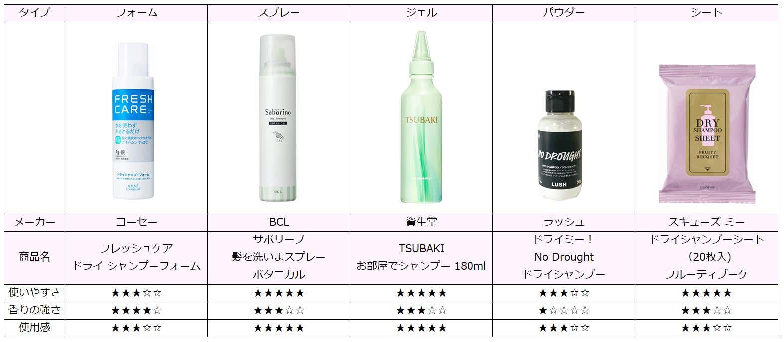 今回レビューするドライシャンプーは5種類。店頭やネットで販売されているさまざまなタイプの中から、「フォーム」「スプレー」「ジェル」「パウダー」「シート」をそれぞれ1つずつ選びました。