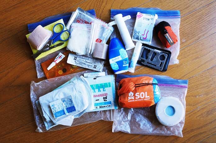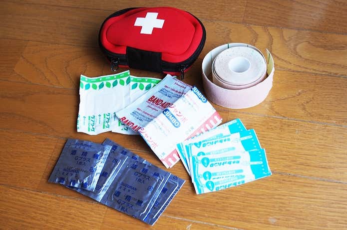 上の写真はあくまで一例ですが、大判&標準サイズの絆創膏が各数枚、滅菌ガーゼ数枚に固定用テープが約3メートル分。ミニマルなセット内容ですが、ちょっとしたすり傷や靴ずれ、足首固定などの処置なら対処できそうです。
