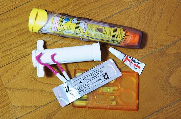 中身を詳しく見ていくと、ポイズンリムーバーやマダニ除去用ツイスター、挫創時の止血目的での瞬間接着剤や簡易裁縫セット、医療用カッター、アナフィラキシーショック回避用「エピペン」(医師による処方が必要) や予備コンタクトレンズなど、自分自身の懸念を補うアイテムを持参しています。