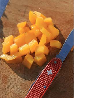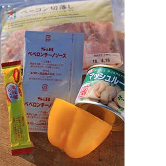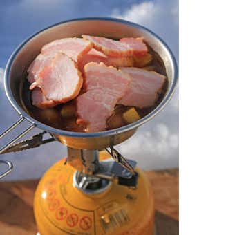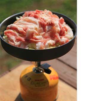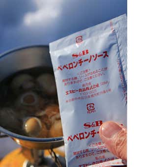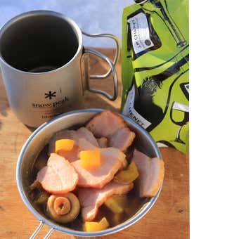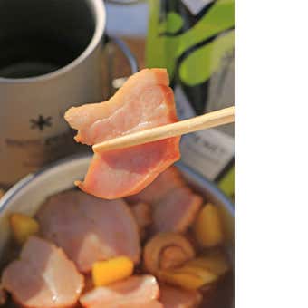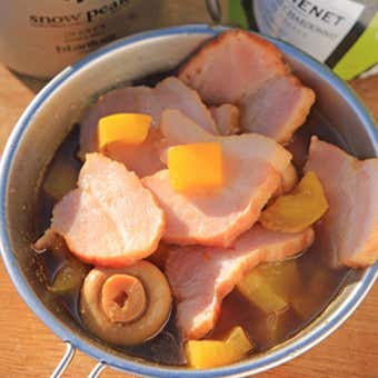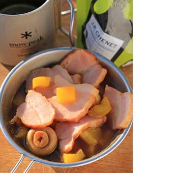 ジューシーでうまみたっぷりな厚切りベーコンに、ペペロンチーノソースのガーリック香が効いていて、白ワインがとまらない。シェラカップひとつでできて超お手軽ですが、青空レストランにふさわしい山ごはんになります。