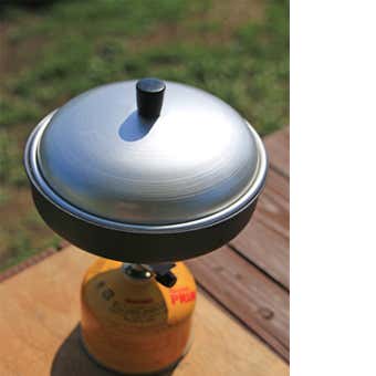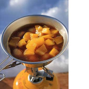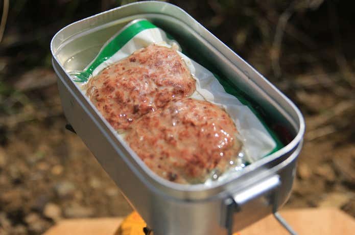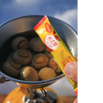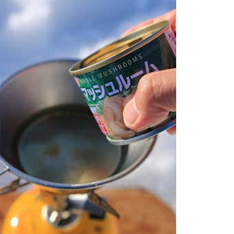 ①マッシュルーム缶を汁ごとシェラカップに入れ、バーナーの弱火にかける。