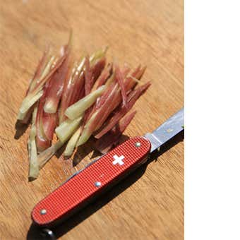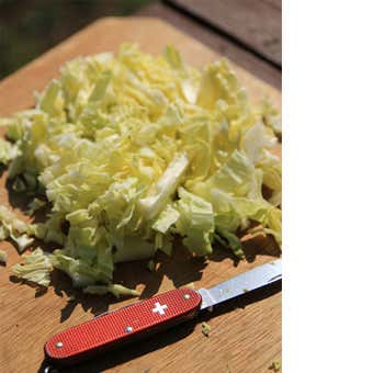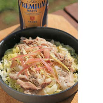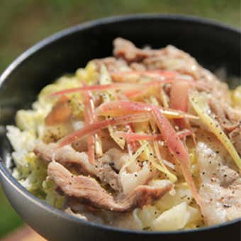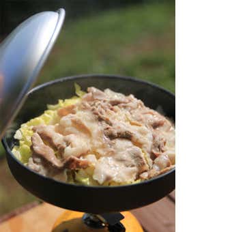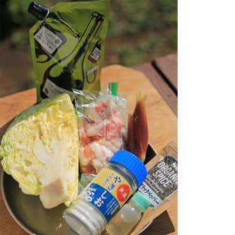 酢と白ワインで蒸されたキャベツはやわらかく、酸味があって、みょうがの爽やかさと、豚バラのジューシーさが絶妙の相性。白ワインが隠し味になっているので、ワインにあうこと間違いなし。肉と野菜の両方のパワーをもらえる、元気の出る山ごはんです。
