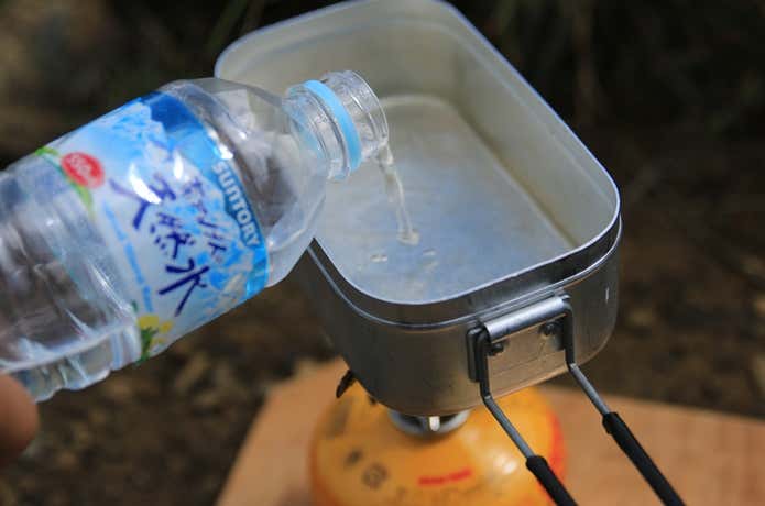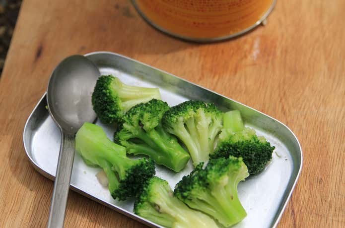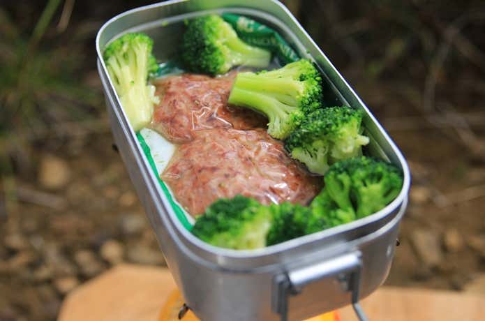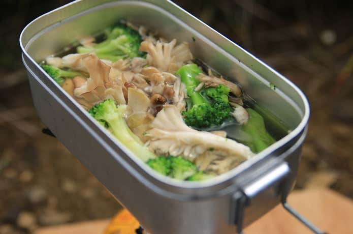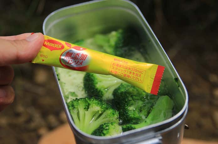 ※フリーズドライシチューを入れるときには、一度ブロッコリーをメスティンから取り出しておくと、スムースに溶かすことができます。