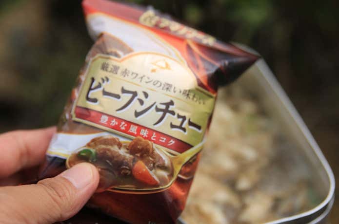 ⑥フリーズドライのビーフシチューをお湯に溶かす。