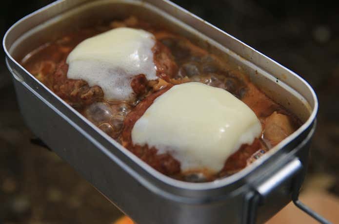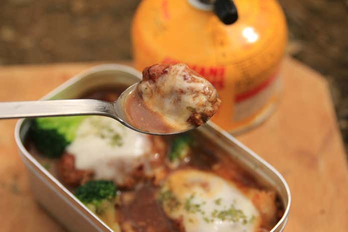 舞茸がシチューの味にコクを加え、ブロッコリーの野菜感もあって、フリーズドライとは思えない出来映え。デミグラスソースで煮込まれたハンバーグはジューシーで、とろとろのチーズがさらに本格的な味わいを醸しだし、赤ワインがとまりません。