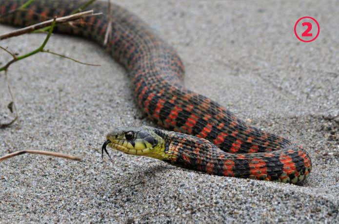 ② | ヤマカガシ | 本州、四国、九州 | 約 70cm〜120cm | おとなしい性格で咬まれることは少ないですが、毒はマムシやハブに比べてかなり強烈。 毒牙以外に首の後ろの頸線にも防御用の毒を持っています。 東日本では赤と黒のマス目模様ですが、西日本では緑褐色、地域によって色や模様の変化があるので注意が必要。 |