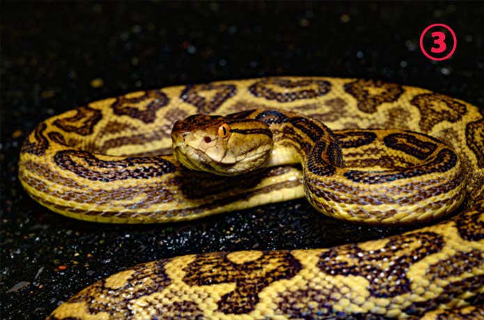 ③ | ハブ | 南西諸島 | 約100cm〜200cm | 大きいものでは2メートル以上にもなる大型のヘビ。 攻撃性が高く、毒性はマムシよりも弱いですが、1.5cmの長い毒牙で深く刺さり、毒量も多いので症状は重くなります。 基本的には夜行性で、昼間は草地や穴の中で休んでいます。 黄色地に黒のかすり模様が多いですが、白色地のものも生息。 マムシと同じように温度を可視化しています。 |