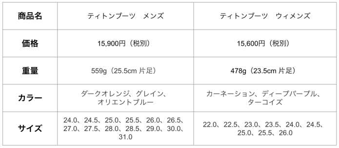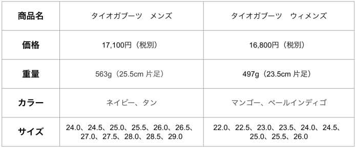 タイオガブーツは、足の周囲サイズで男女それぞれ2タイプから選べます。