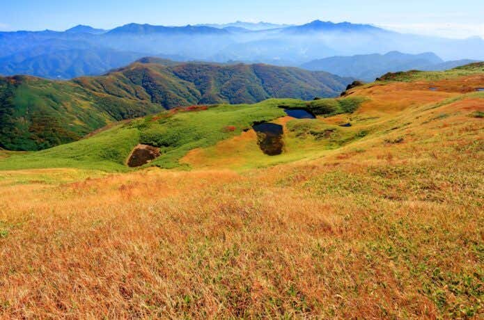 秋になると山全体が燃え上がるように染まる様は圧巻。「天狗の庭」から山頂を仰ぎ見るのもよし、山頂から天狗の庭を見下ろすもよし。どこを眺めても真っ赤な草紅葉と池塘の絶景が広がります。