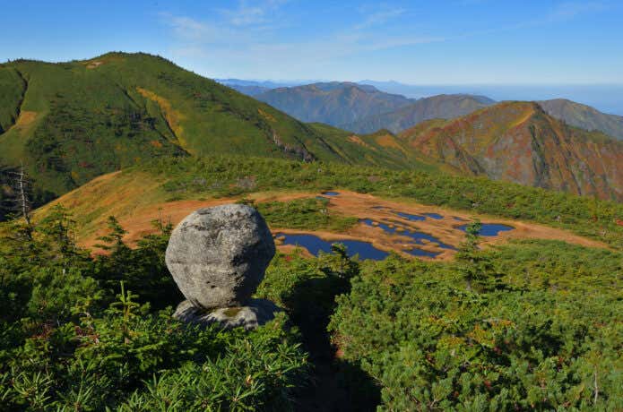 山頂から先にあるのが、平ヶ岳のシンボル・玉子石。ここから眺める、煌めく池塘が散らばる湿原の光景は、ここまで登ってきた人だけのご褒美。自然の造形美に登山の素晴らしさを感じることができます。ちなみに、玉子石は1つの花崗岩が風化によって削られ、芯だけが残った非常に珍しいもの。