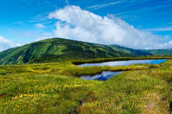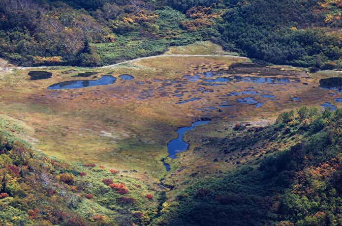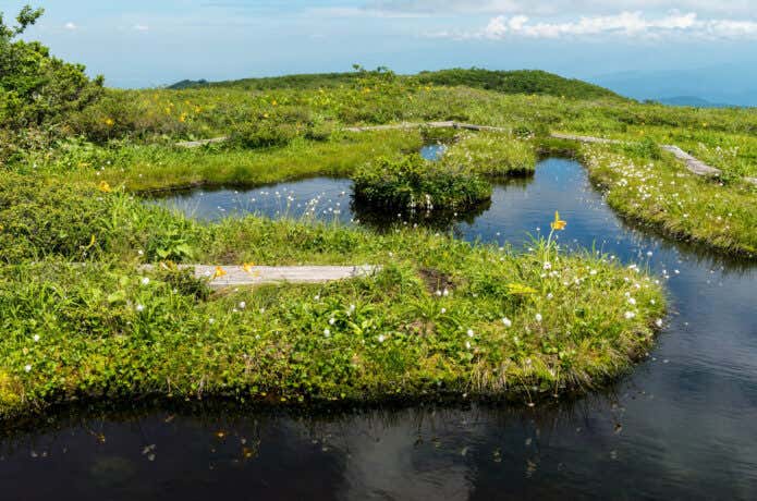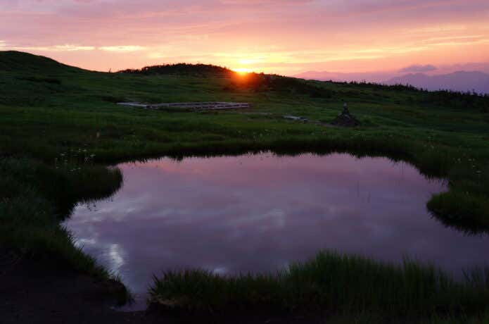 山頂から足をのばした先には、浮島のある池塘がありなんとも不思議な雰囲気。夏にかけては、緑の草原を貫く木道がニッコウキスゲやワタスゲが満開のフラワーロードとなり、登山者の目を楽しませてくれます。