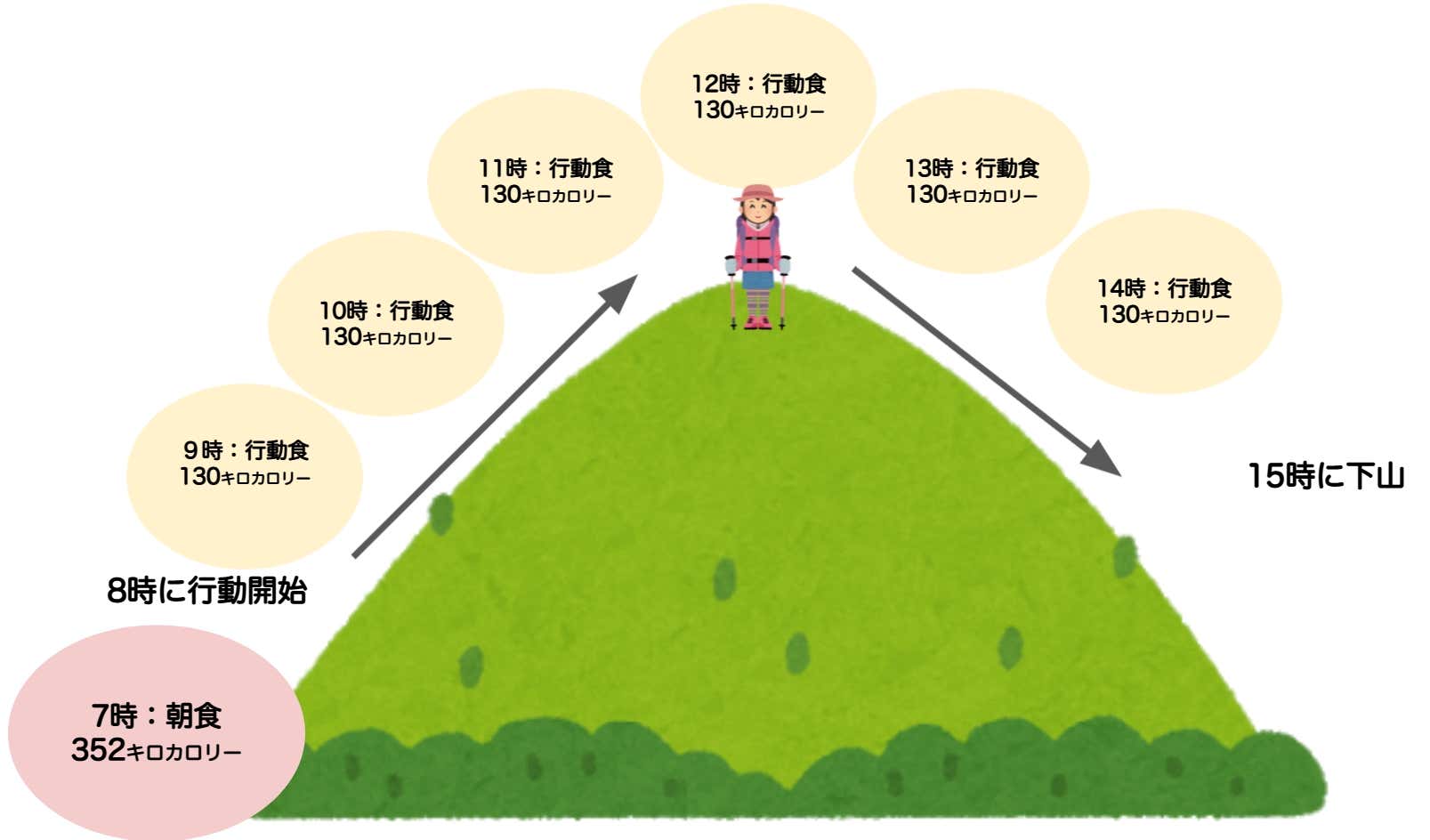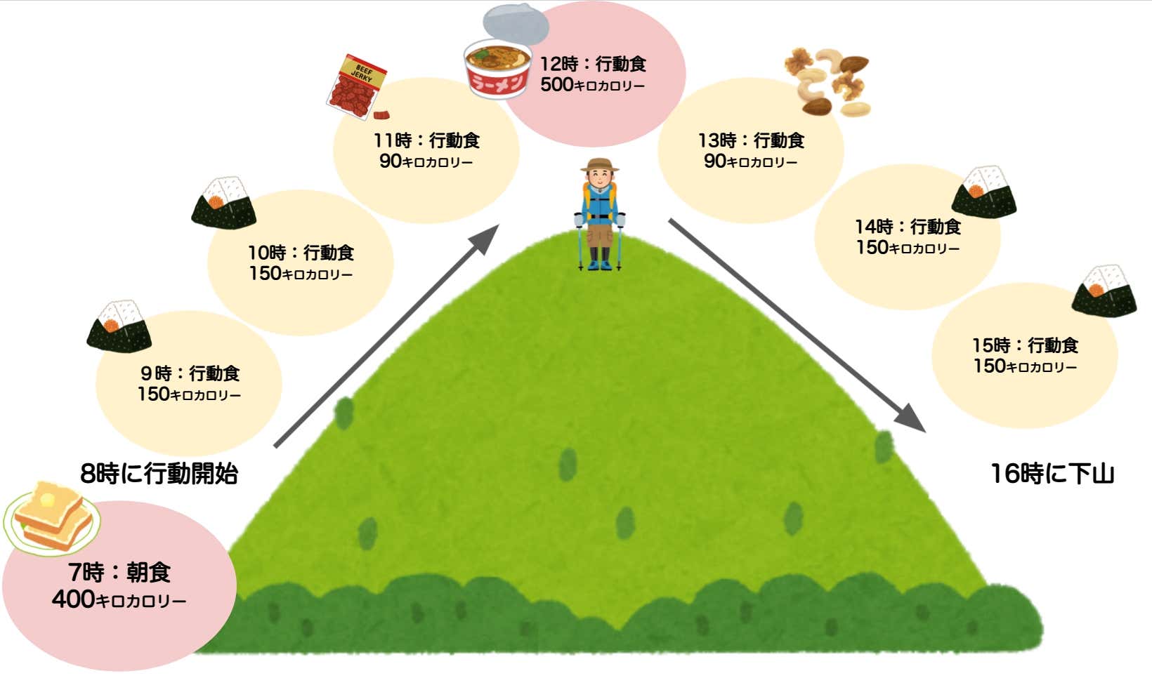 吸収できるエネルギー量にも限界があるため、必要な量を知って、1〜2時間ごとに細かく分けて摂取していくのがコツです。そのため、山での食事は昼食(お昼にまとめて食べるご飯)というワードを使うのではなく、小刻みに行動中に食べる「行動食」というのが一般的。