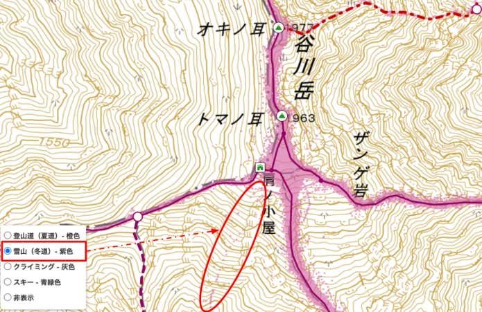 地図の出典:ヤマレコ(上:登山道(夏道)レイヤー/下:雪山(冬道)レイヤー)