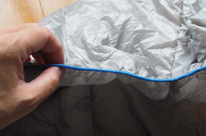 一方、触った感じでは「これ、本当に大丈夫……?」と不安になる薄さ。実はこのシュラフには「プリマロフト・エアロジェル」が使用されています。最近ではインサレーションウェアにも使用されている、断熱性に優れた軽量の素材。新しいもの好きとしても、この素材を使った化繊半シュラというのは試してみたい!