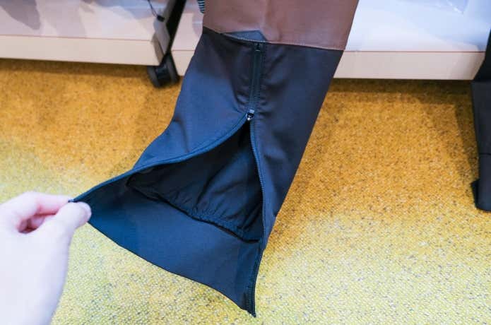 裾はジップで開閉できるようになっています。上下共に撥水加工が施されているので、ちょっとした雨なら問題なし。