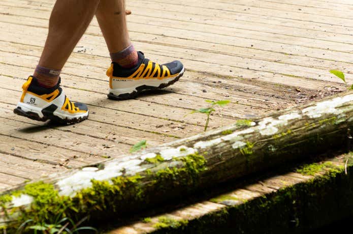 私は通常、この手のローカットシューズを履く時には薄手の5本指ソックスを使用していますが、今回のXウルトラ プロ GTXの場合は、中厚手のトレッキングソックスを履いて、よりフィット感を出した方がソフトな履き心地に足が包み込まれ、調子がよいこともわかりました。