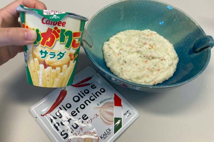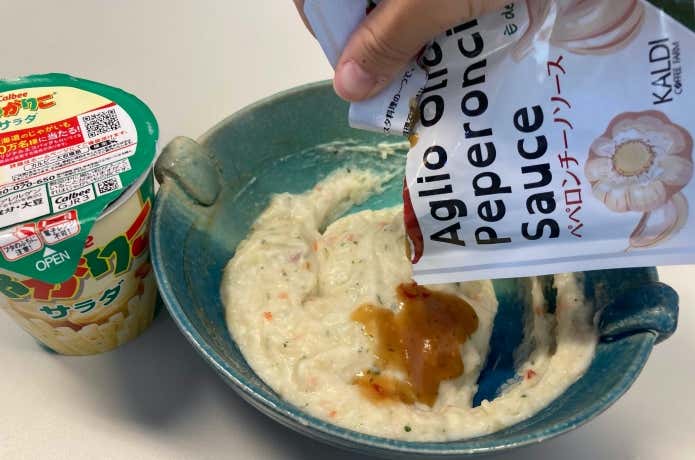 しかしやってみると、若干薄味なのがネックなんですね。なんとかして塩気と旨みをプラスできないものか……ああ、ここにペペロンチーノソースがあるじゃないか!