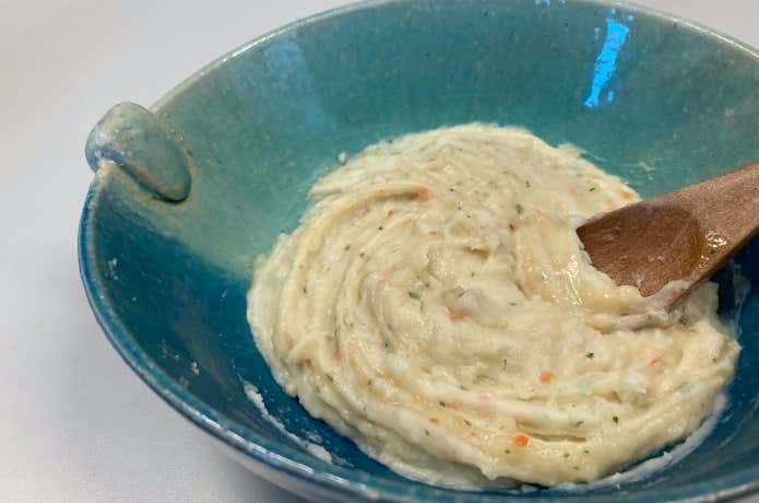 サバ缶1つにつき小袋1つを混ぜ合わせればパテの完成です。今回は1缶を3つに分け、パテの素を適量加えて作ってみました。
