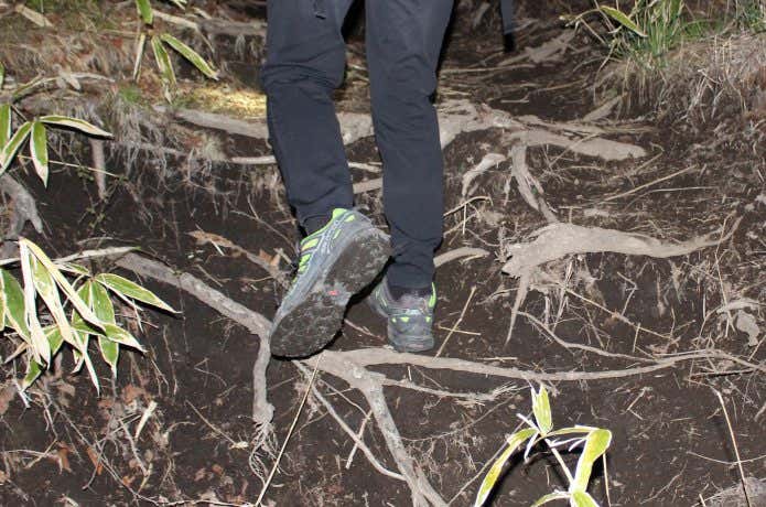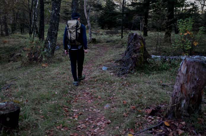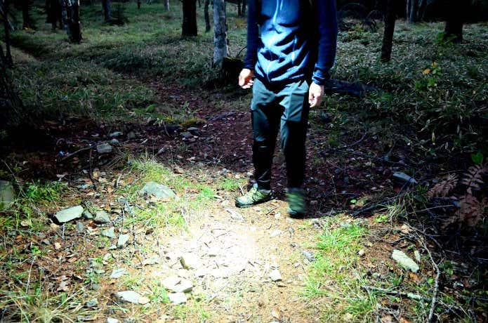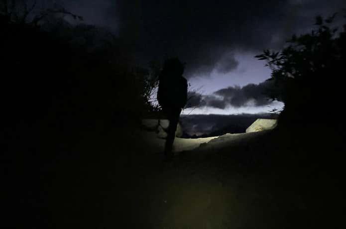 まだかろうじて見えないこともないのですが、登山道がはっきりわからず、石や木などでつまずく危険を感じたため、日没後25分でヘッドライトを点灯しました。