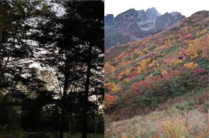 撮影:筆者(左:樹林帯、右:視界がひらけた高山帯)