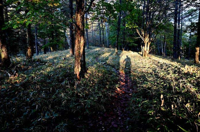 上の2枚の写真はどちらも同時期の日没直後に撮影したもの。ここから同じ時間帯や天気であっても、樹林帯にいるか、稜線などの視界が開けた場所にいるかどうかで、明るさが異なることがわかります。
