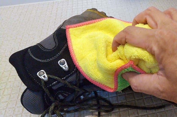 ラバー部分やアッパーが汚れていたら、水で濡らした布で拭きあげます。そんなとき、「マイクロファイバーぞうきん」が最適。通常の布雑巾よりも細かい繊維でできているため、汚れを吸着し、素早く水を拭き取れます。
