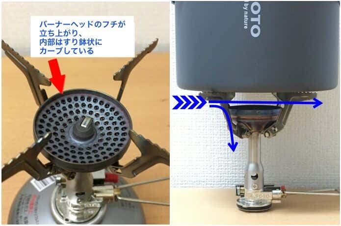 バーナーヘッドのフチが立ち上がり、内部がすり鉢状にカーブしていることで、炎が中央に集まる構造。また、フチの高さより低い風は下側に流れ、炎が出る部分には直接風があたりにくくなっています。