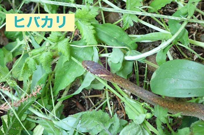 ヘビの種類は「アオダイショウ、シマヘビ、ジムグリ、シロマダラ、ヤマカガシ、ヒバカリ、タカチホヘビ、マムシ」。(※北海道では、アオダイショウ、シマヘビ、ジムグリ、シロマダラ、マムシの5種)
