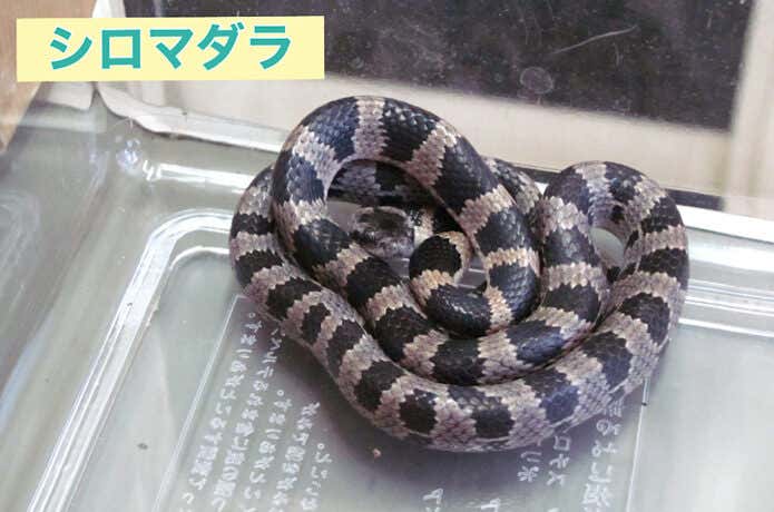 シロマダラ小型のヘビ。出目で黒と白のまだら模様。あまり見かけない