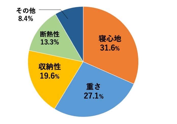 「重さ」(27.1%)、「収納性」(19.6%)に次いで、4番目に多かったポイントは「断熱性」(13.3%)。そして、もっとも多くの先輩登山者が重要と答えたのは「寝心地」(31.6%)という結果に。