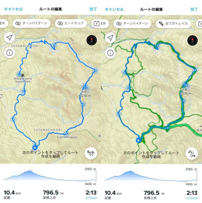 ここで便利なのが「ヒートマップ機能」。これを使うとSUUNTOユーザーが実際に歩いた軌跡が表示されるので、歩くルートを見つけやすくなります。