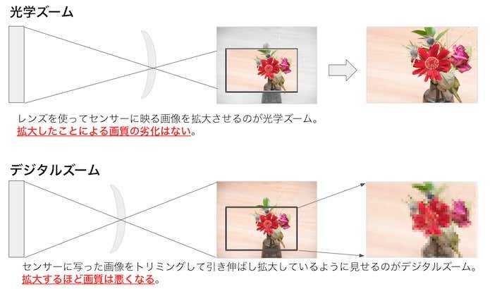 レンズの焦点距離を変えるズームは「光学ズーム」と呼ばれており、拡大しても画質が悪くなることはありませんが、「デジタルズーム」の場合は拡大するほど画質が劣化します。パンフレットなどで高倍率ズームを謳っている場合、それが「光学ズーム」によるものなのかどうかは確認しておいた方がいいでしょう。