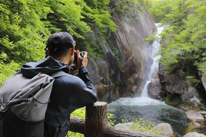 最初の見どころは、名瀑百選にも選ばれている、高さ30mの仙娥滝(せんがたき)。