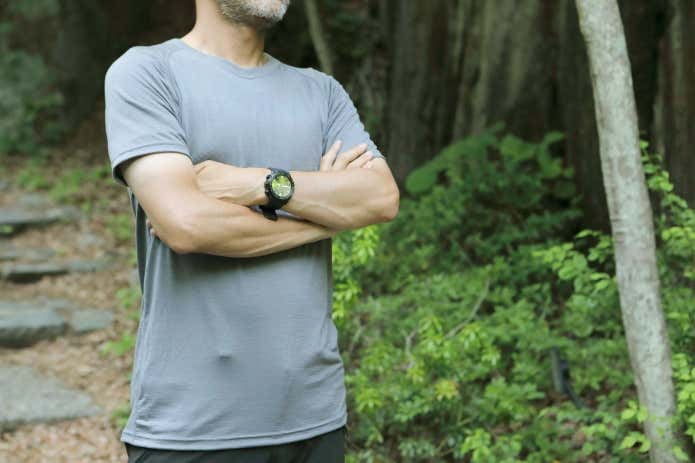 肌触りがサラッとしているし、やや細身でシルエットもきれい。落ち着いたカラーも、大人のアウトドアという感じでいいですね。