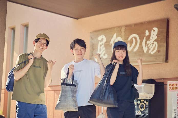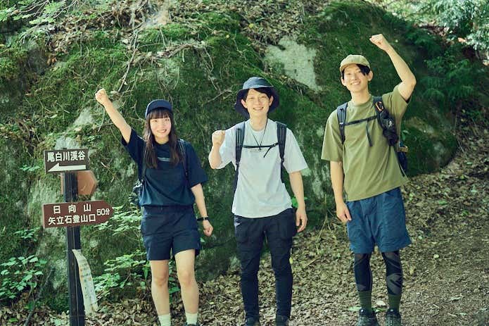 本日しょーまさんと一緒に日向山を目指す仲間は、ACTIBASEのメンバー・らんかさんとたくろーさん。3人とも「ROGER EGGER」の色違いのお揃いTシャツと帽子でコーディネートしてもらいました。