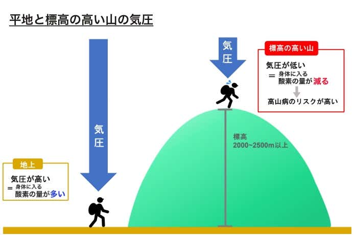 簡単に言うと、「標高が高くなると酸素が薄くなり、体内の酸素が不足することで高山病の症状が起こる」というわけです。