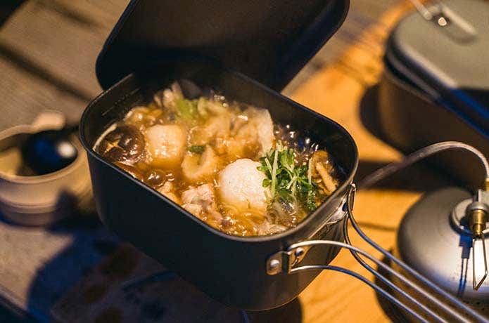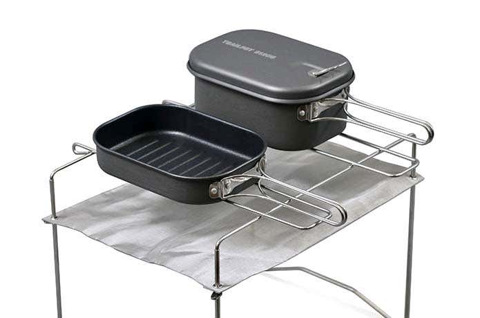 本製品は、深なべ、ふた、フライパンの3つのアイテムがセットになっています。2人分のご飯や鍋料理を作れる深なべ、グループ登山で誰か1人は持ってきて欲しいフライパン、皿になるフタと、ソロにもグループにもちょうどよい組み合わせ。