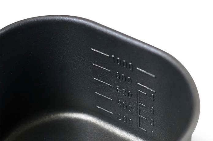 深なべの容量は実用 1L(満水 1.2L)で、目盛りは 200ml 刻みで1,000mlまで、炊飯用水加減の目盛りも刻んでいます。2合まで炊飯できます。