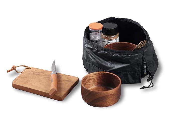 クッション性のある収納袋はクッカーを入れても上部に余裕があるので、調理に必要なあれこれをひとまとめにできます。