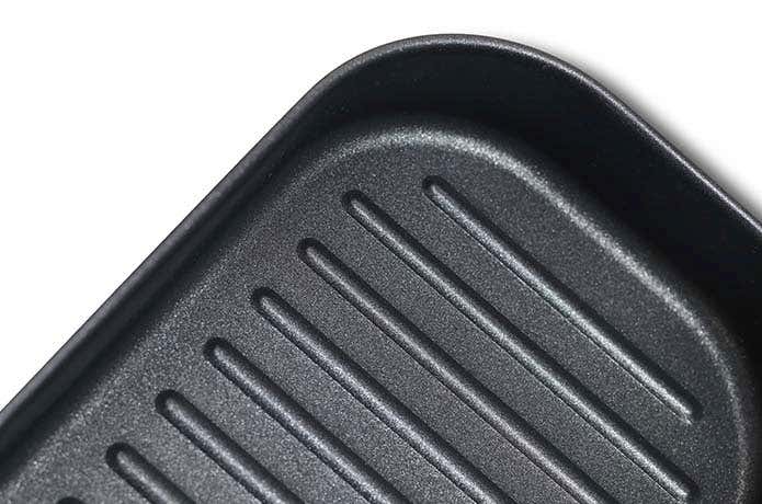 鍋とフライパンにはお手入れしやすいフッ素樹脂コーティングを施しています。フライパンは焦げ付きにくいグリル仕様。