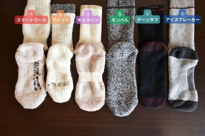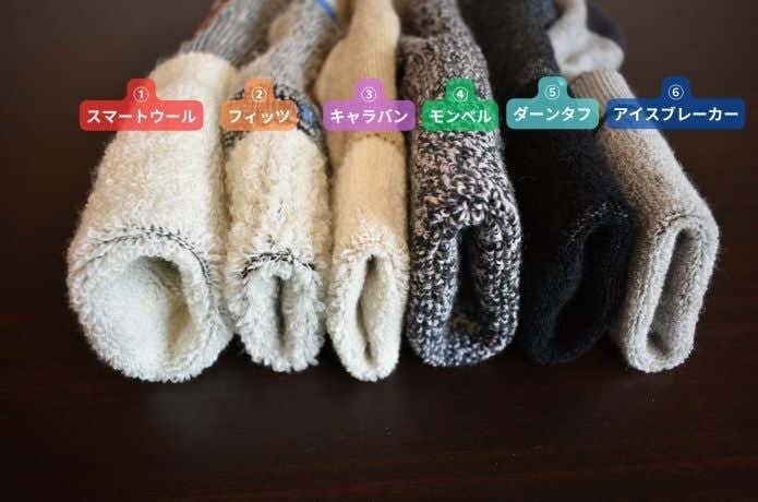 スマートウール=フィッツ=モンベル>キャラバン=ダーンタフ>アイスブレーカーで、3つのソックスがほぼ同じくらいの長さ。パイルの「密度」についてはモンベルが最も高くなっていました。