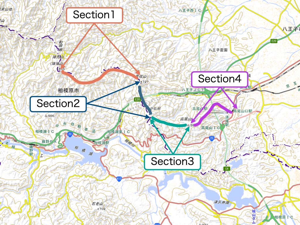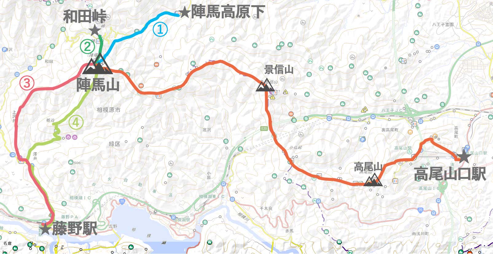 陣馬山(40分) → 明王峠(90分) → 景信山(55分) → 城山(60分) → 高尾山(100分) → 高尾山口駅