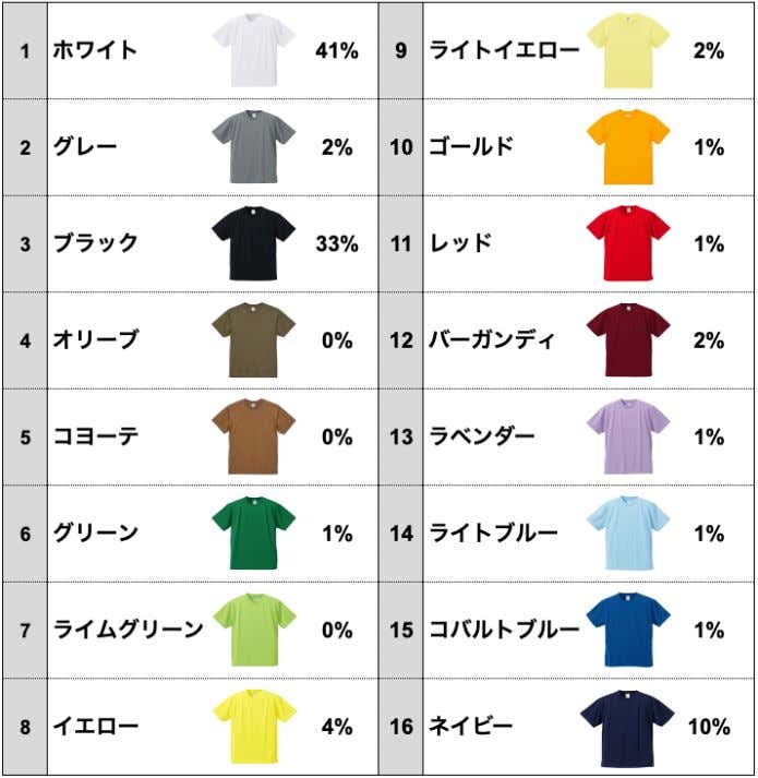 それ以外の色は0〜2%と、上位4色に票がほぼ集まりました。やはりホワイトとブラックは汗染みが目立たないという印象が圧倒的に強いようです。