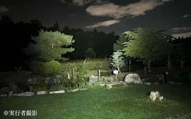 E3Plusは照射角度の広さに加えて、遠方まで届く光源の強さも魅力。遠方にある100mほど離れた森林まで光が届いているのがわかります。
