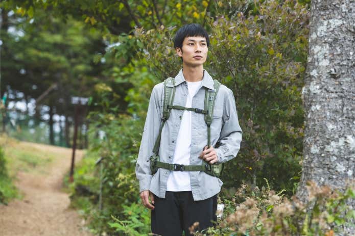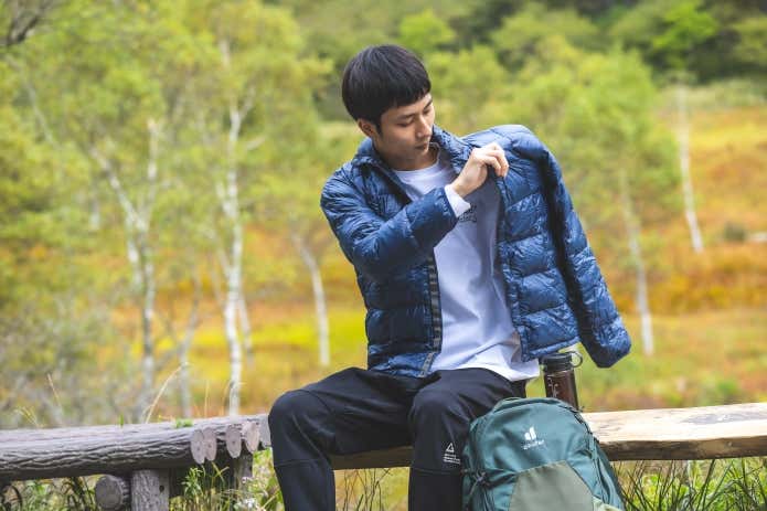 体が温まってきたら山シャツを脱いでバックパックに収納し、一息入れる休憩には防寒のためにダウンウェアを着用。そして、また歩き始めるときに山シャツを着直す…。